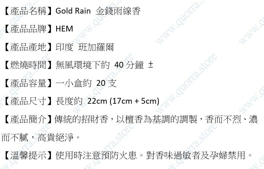 印度 HEM Gold Rain 金錢雨線香 (招財、好運、促事業、家用薰香)